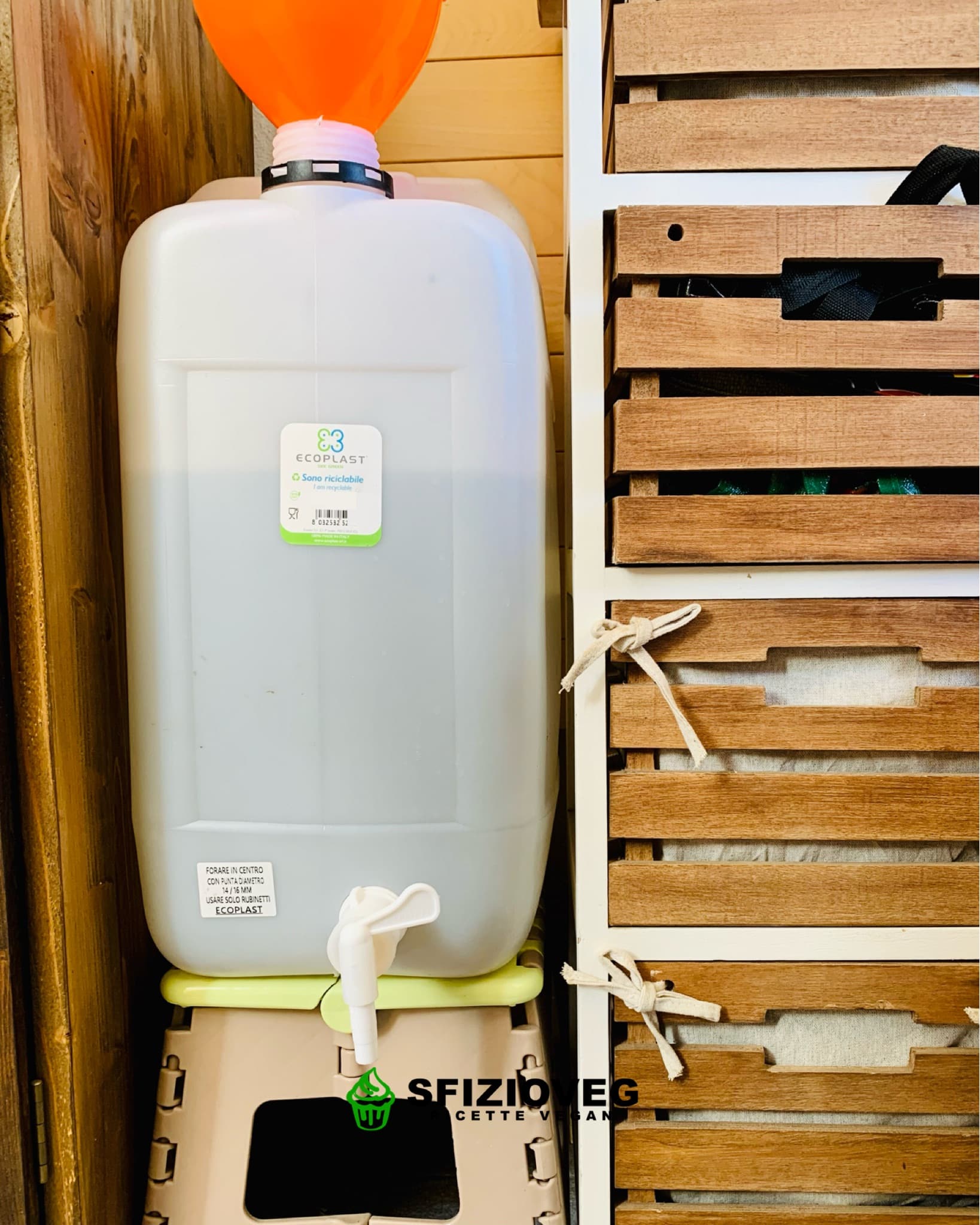 Come detto nel paragrafo precedente le prime settimane sono state di test e mi sono arrangiato con un secchio da 10 litri che riempivo ad ogni lavaggio di verdura. In pratica lavavo le verdure in una bacinella, per poi versare l’acqua all’interno del secchio.